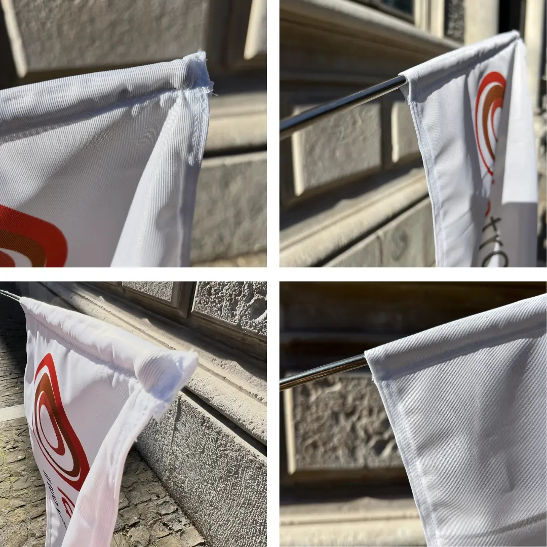 La bandiera è realizzata in tessuto poliestere nautico grammatura 110 g/m² con doppie cuciture perimetrali. Dotata di asola laterale di larghezza 2 cm aperta sotto e chiusa sopra per l’inserimento dell’astina telescopica di diametro 1 cm. Il poliestere nautico è un tessuto tecnico resistente, ideale per bandiere destinate all’esposizione esterna. Il tessuto è lucido con colori brillanti e un leggero effetto riflettente. Alta resistenza a vento, sole, pioggia e agenti atmosferici, mantenendo nel tempo colori ben visibili. Consente un’ottima resa della stampa con effetto passante. Lavabile in lavatrice a 30 °C con detergenti delicati.