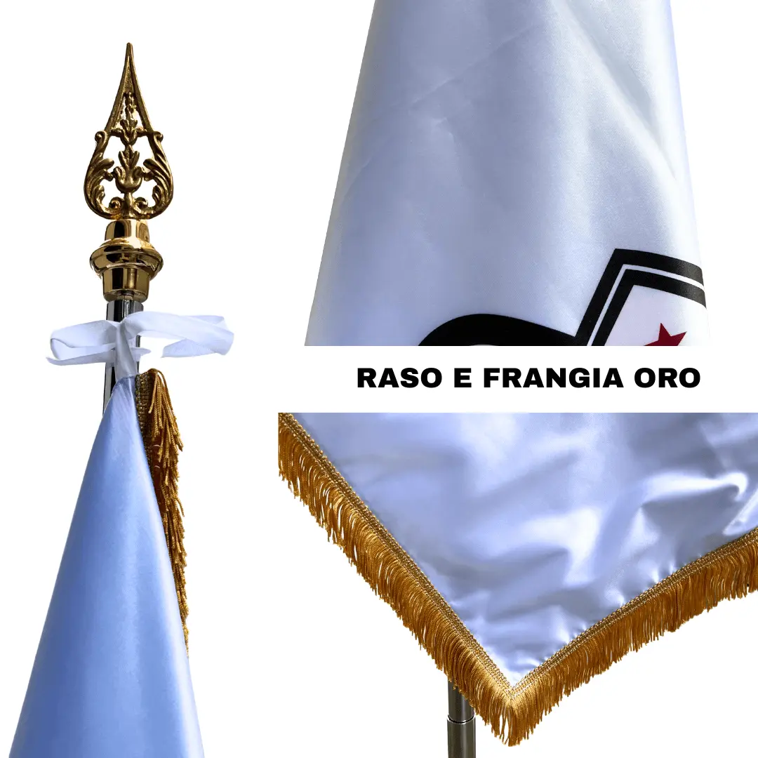 La frangia oro è una finitura tipica delle bandiere da interno di rappresentanza, di solito nel formato 100×150 cm realizzate in tessuto di raso o stamina. Viene applicata lungo tutto il perimetro della bandiera, ad eccezione del lato sinistro, dove sono presenti coppie di laccetti per il fissaggio all’asta. Frangia oro di lunghezza 5 cm. Questo elemento decorativo valorizza la bandiera conferendo un aspetto solenne ed elegante, particolarmente adatto ad ambasciate, cerimonie ufficiali e ambienti istituzionali di alto livello.