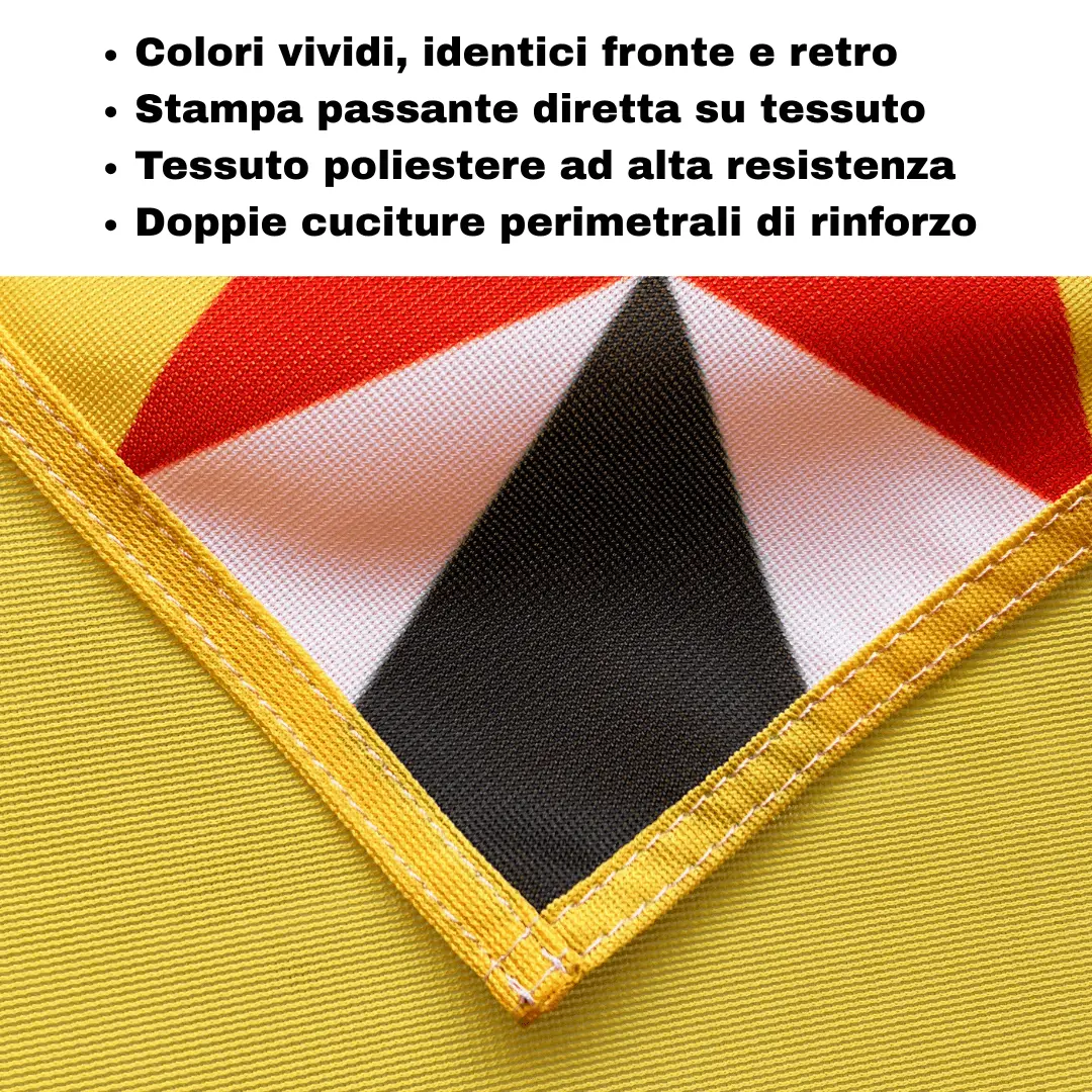 Le nostre bandiere sono realizzate con doppie cuciture perimetrali e doppio orlo, ottenuto ripiegando il bordo del tessuto due volte per aumentare resistenza e durata nel tempo. Le cuciture sono eseguite con filato di poliestere a filamento continuo, materiale progettato per assicurare solidità anche in caso di esposizione prolungata all’esterno. Le bandiere sono disponibili in tutte le dimensioni e possono essere realizzate con diversi tessuti professionali, tra cui poliestere nautico 110 g/m², stamina in fiocco di poliestere 140 g/m², raso di poliestere bifacciale 120 g/m² a telo, selezionati in base alla destinazione d’uso e al tipo di esposizione. Le finiture possono includere guaina con corda per bandiere da esterno, asola per l’inserimento dell’asta, frangia oro per bandiere da interno di rappresentanza e cerimoniali. I materiali utilizzati sono di alta qualità e garantiscono elevata resistenza al vento, alle intemperie e agli agenti atmosferici. La stampa diretta su tessuto consente all’inchiostro di penetrare in profondità nelle fibre, permettendo il passaggio del colore sul retro fino al 95-98%. La stampa serigrafica ad alta definizione garantisce colori intensi e uniformi su entrambi i lati della bandiera, evitando l’effetto sbiadito sul retro tipico delle produzioni di qualità inferiore. Tutte le bandiere fino alla dimensione 300×450 cm (altezza x base) vengono realizzate in telo unico, senza cuciture di giunzione centrali, per una resa visiva più pulita e uniforme, evitando che scritte, loghi o stemmi risultino attraversati o interrotti da cuciture. Starflag è tra le poche realtà in grado di fornire bandiere realizzate in telo unico fino a 3 metri di altezza, disponibili in qualsiasi materiale.